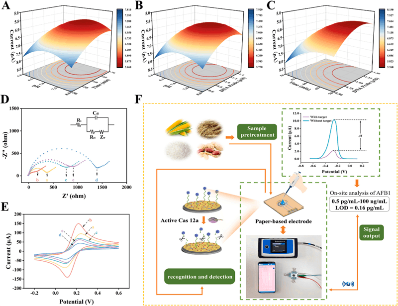 MXene异质结构,用于AFB1的高灵敏快速检测。该适体传感器利用具有优异电子传递性能的Au@Ti3C2 MXene放大电化学信号,同时通过AFB1特异性适配体触发CRISPR/Cas12a的反式切割活性,从而实现高特异性检测。借助PalmSens4便携式电化学工作站,该纸基电化学传感平台在0.5 pg/mL–100 ng/mL范围内呈现线性检测,检测限低至0.16pg/mL,且在加标实际样品中的回收率达到93.0%–106.0%,证明了其作为快速、便携工具用于实际样品中霉菌毒素现场分析的潜力。