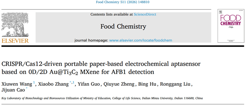 黄曲霉毒素B1(AFB1)是一种分布广泛且具有强致癌性的小分子有毒污染物,对食品安全构成严重威胁。因此,亟需开发一种便携、成本效益高且适用于现场部署的方法,以实现对AFB1的高灵敏检测。在本研究中,大连民族大学生命科学学院曹际娟团队开发了一种纸基电化学适体传感器,该传感器整合了CRISPR/Cas12a技术与0D/2D Au@Ti3C2